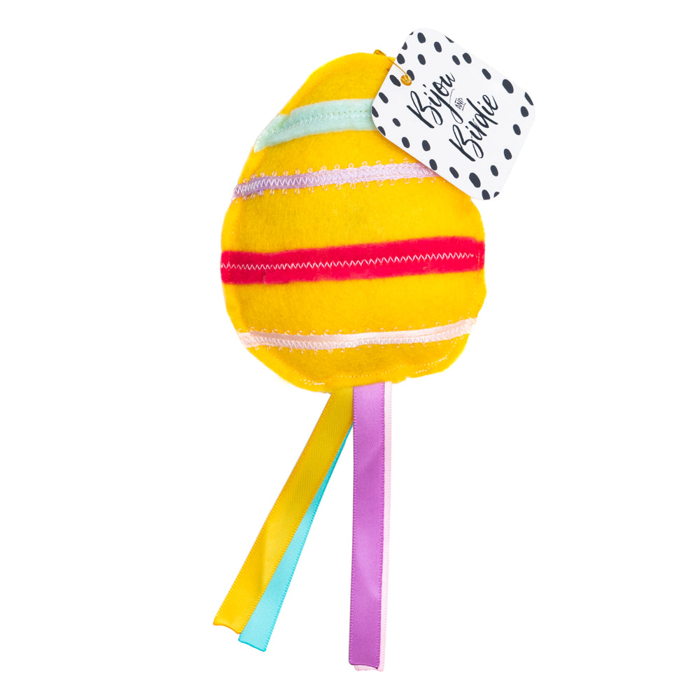 Lovely, bright spring colored easter egg catnip toy with multi-colored stripes and lovely ribbon detail to help kitty celebrate spring in style!