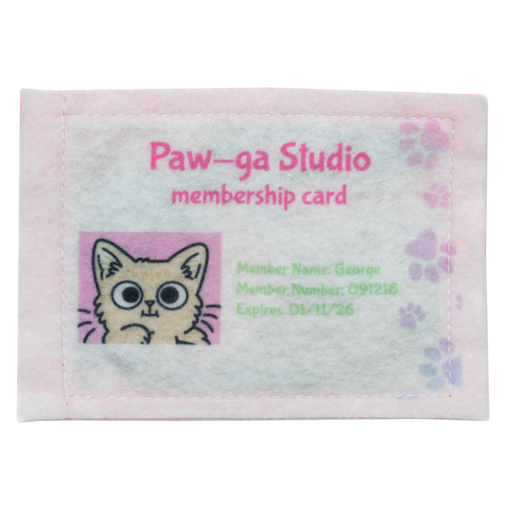 Handmade flat felt toy with catnip inside. Pink on one side, cute Yoga studio membership card artwork on the other. Easy to pass around to the other kitties in your life without the risk of the studio cancelling your membership on you.